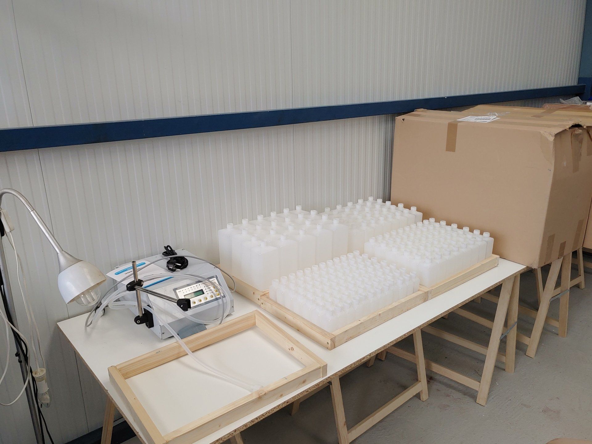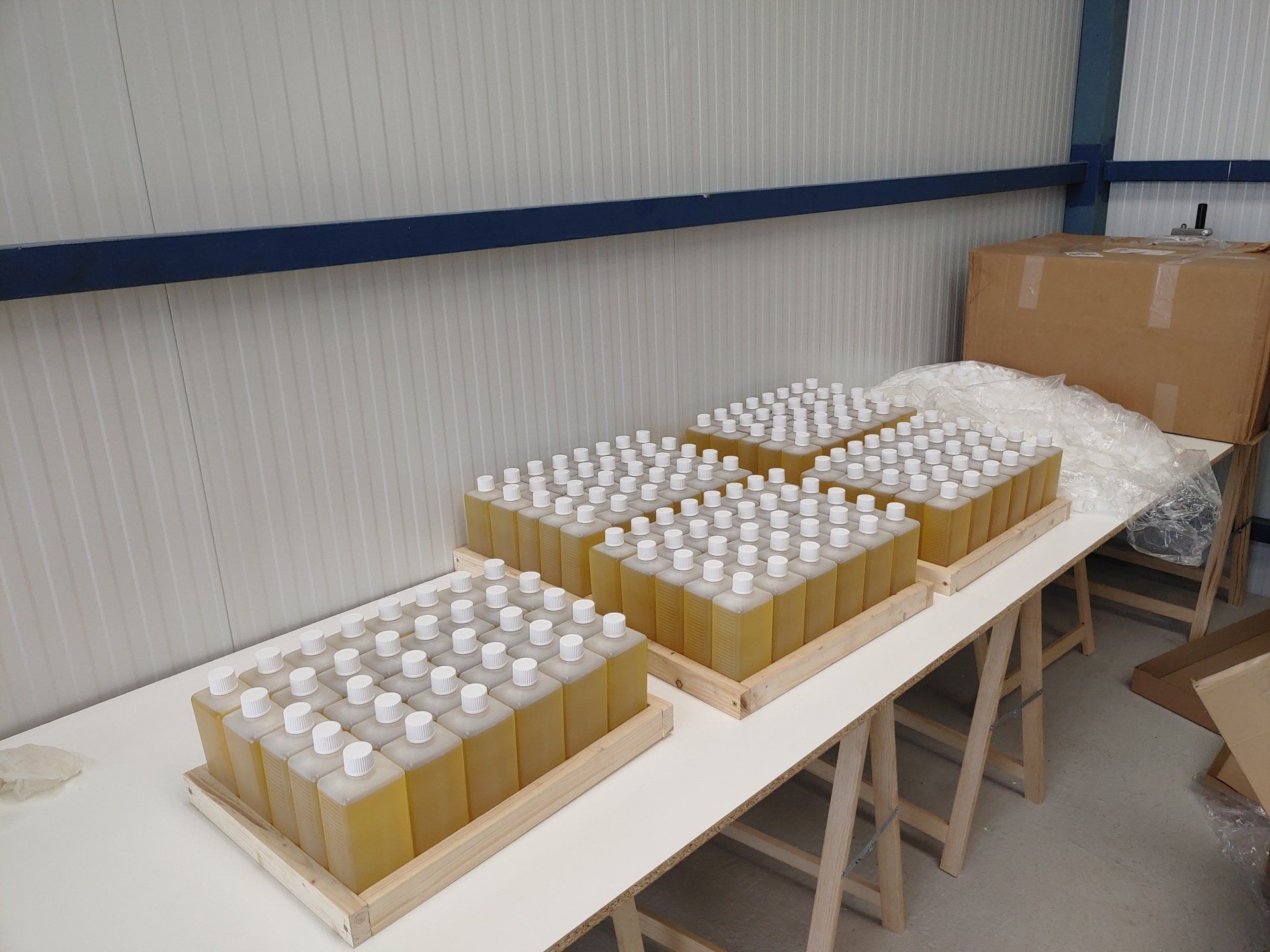 Kaltgepresstes und gefiltertes Indalo Jojoba Öl auf dem Weg in die Flasche