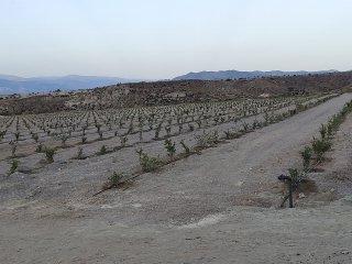 Die ursprüngliche Plantage ist auf Ihrem Höhepunkt. Die zwei sehr dunklen Bereiche, im oberen rechten Bereich des Bildes, sind die neu angezogenen Jojoba-Pflanzen, welche für die Ausdehnung der Plantage herangezogen wurden.